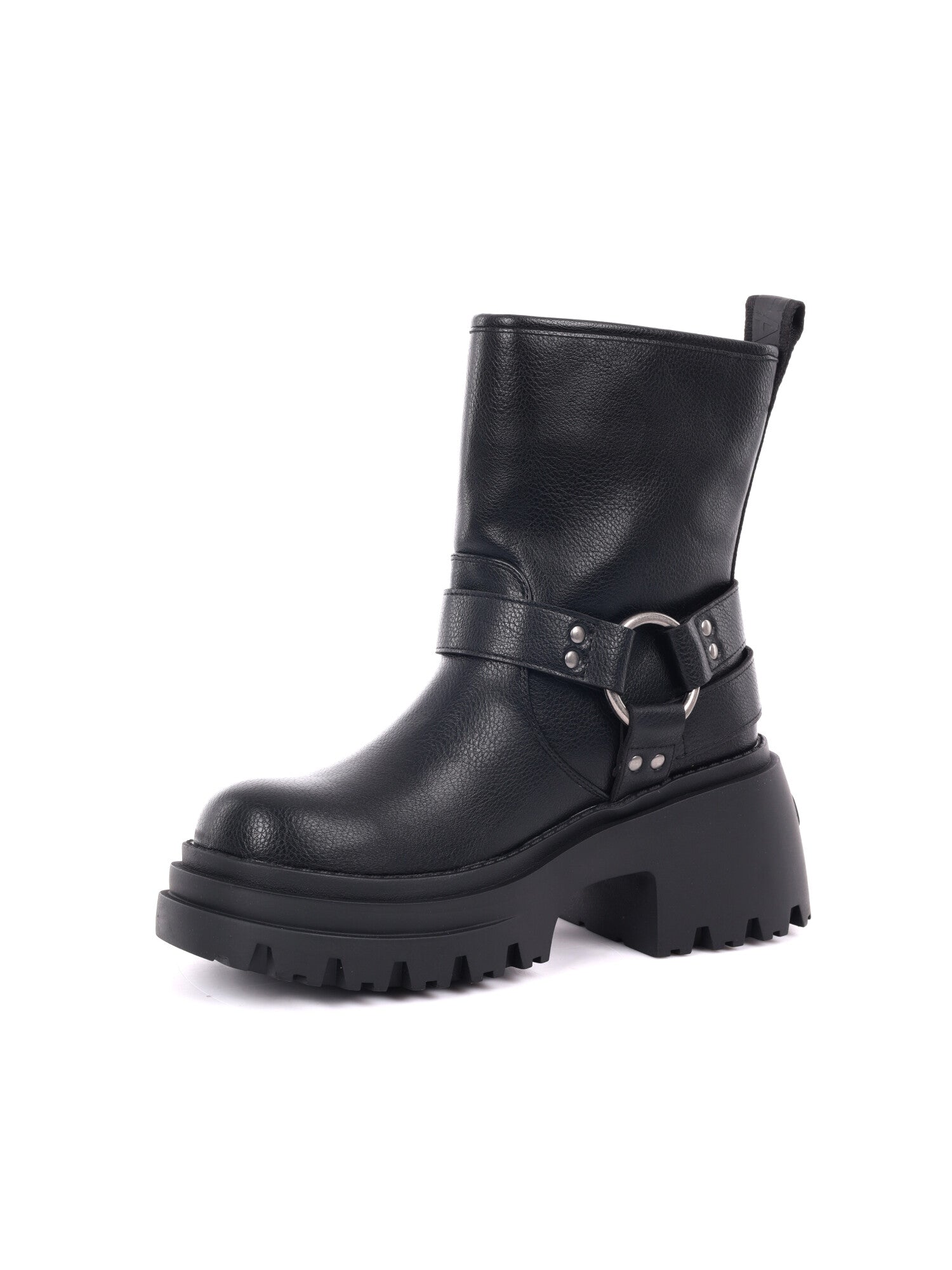 La tomaia nera, dal finish opaco, è valorizzata da cinturini con fibbie metalliche che richiamano lo stile biker in chiave moderna. Il taglio slip-on con zip laterale rende la calzata pratica e veloce, mentre la fodera interna imbottita e la soletta in memory foam assicurano un comfort che dura tutto il giorno.