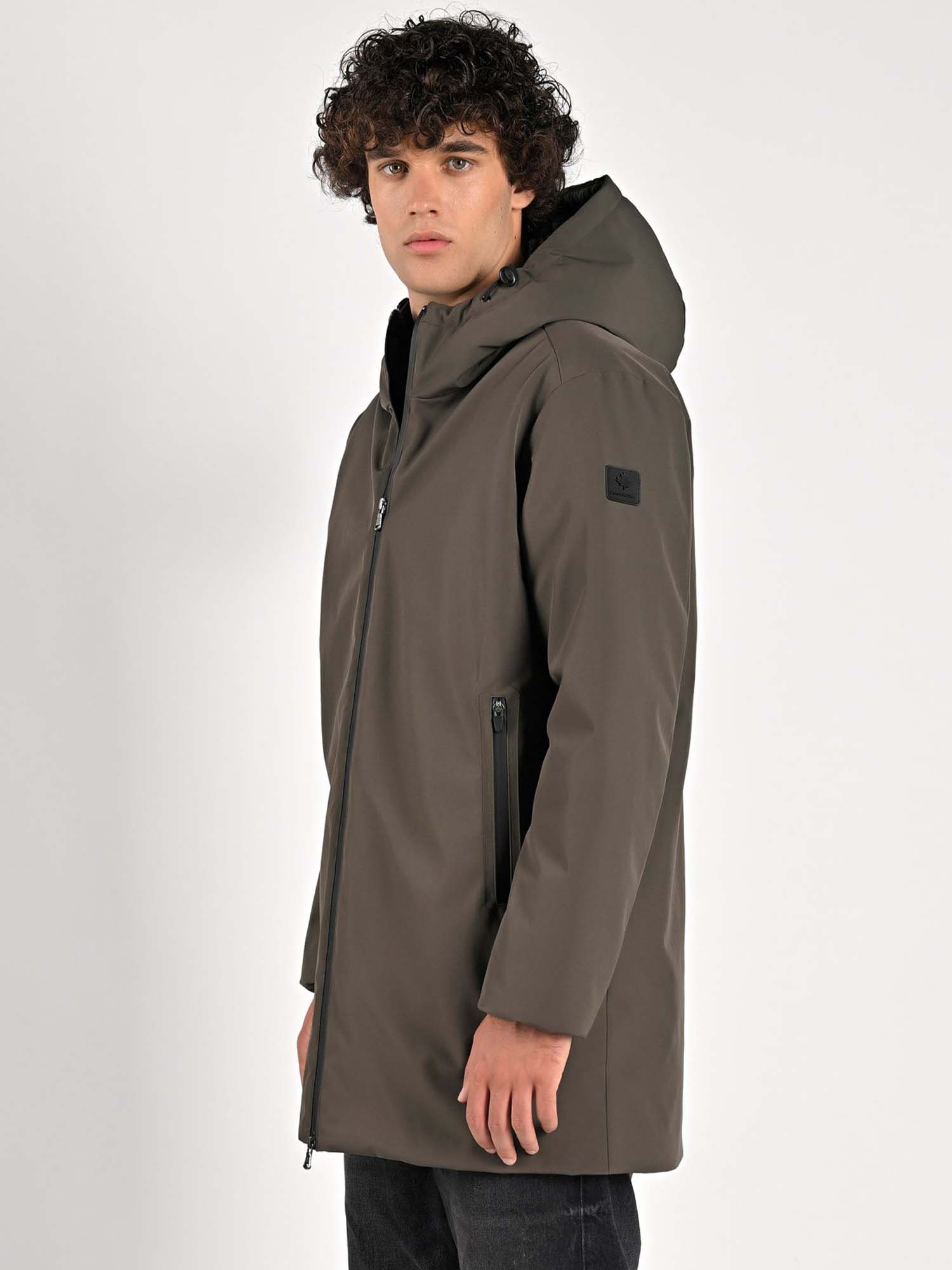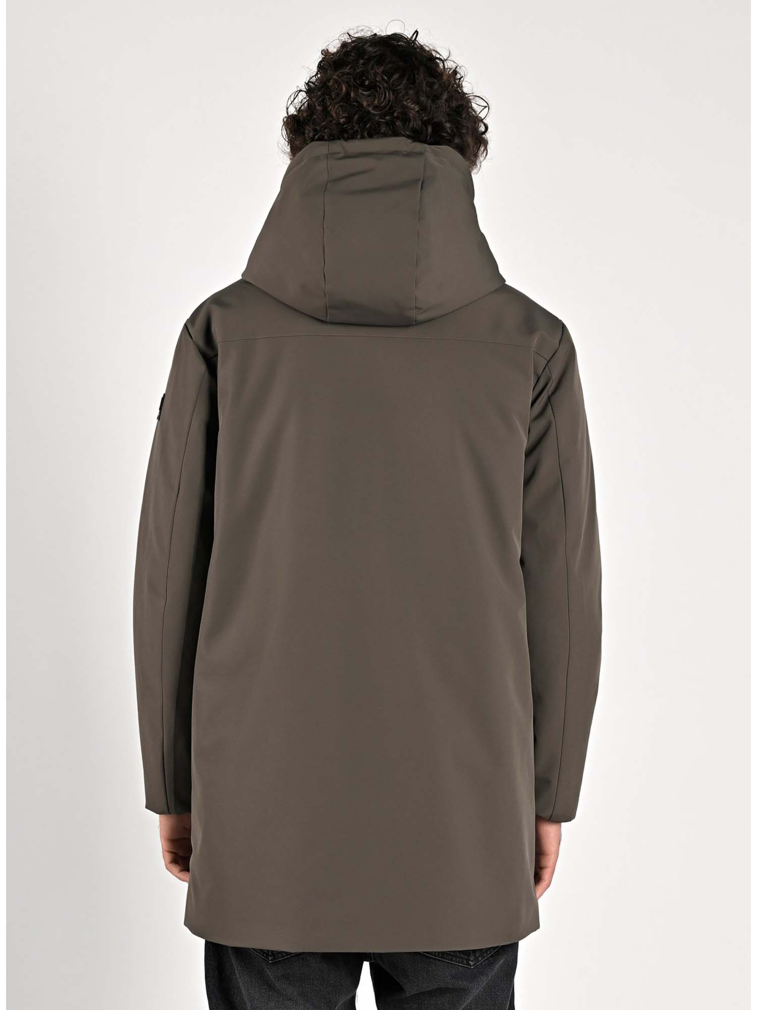 Il cappuccio fisso, la chiusura con zip frontale e le tasche laterali rendono questo parka pratico e versatile, perfetto da indossare sia in città che nel tempo libero. Abbinato a un completo da ufficio sostituisce con eleganza il classico cappotto, conferendo un tocco contemporaneo e ricercato al look maschile.