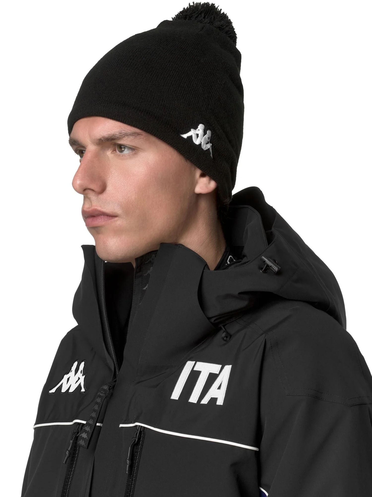Berretto unisex firmato Kappa, collezione Autunno/Inverno, realizzato in acrilico. Presenta una vestibilità ampia con pon pon ed è dotato di fodera interna in pile per un maggiore comfort termico. Completano il design il logo Omini ricamato e le personalizzazioni ITA.