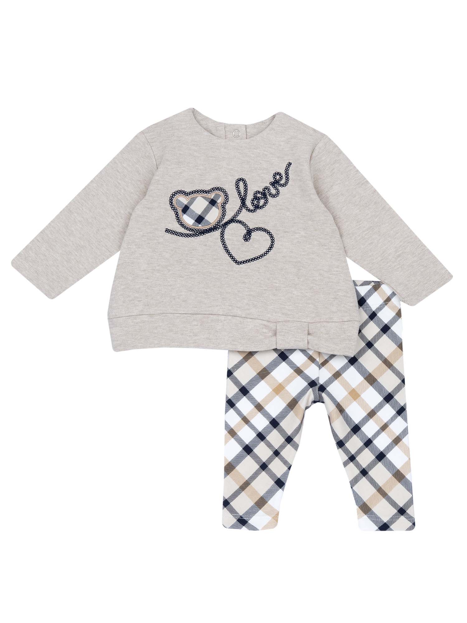 Completo Chicco dolce e raffinato, perfetto per coccolare le bimbe con stile durante la stagione fredda. La morbida maglia, impreziosita da un ricamo “Love” e un tenero orsetto con fantasia scozzese, si abbina armoniosamente ai leggings elasticizzati con motivo tartan. Realizzato in cotone di alta qualità, questo outfit garantisce comfort e praticità senza rinunciare a un look elegante e alla moda, ideale per ogni occasione invernale.