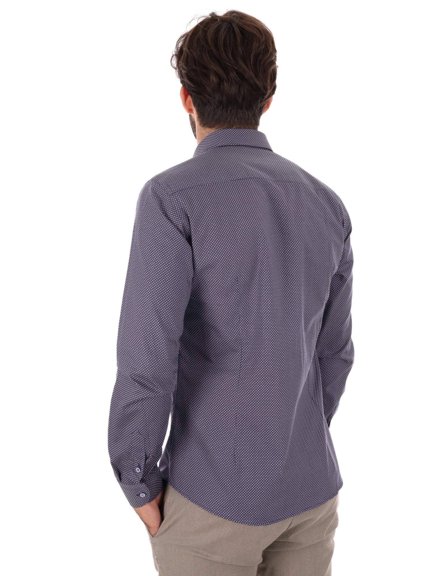 Il motivo a micro fantasia, sobrio e ricercato, aggiunge personalità al capo senza appesantire l’insieme. Un dettaglio che fa la differenza, mantenendo la camicia elegante ma originale.