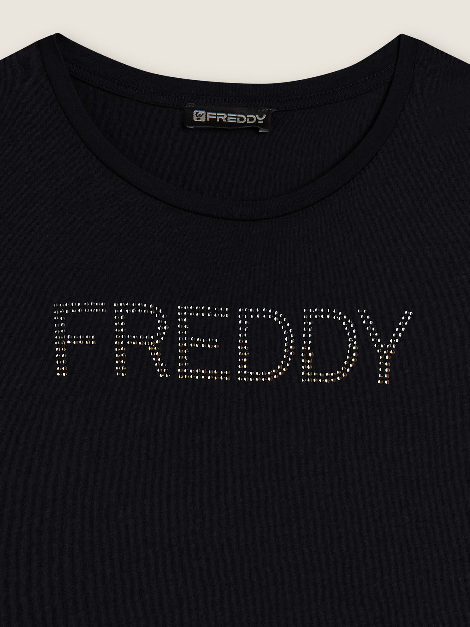 Realizzata in jersey di cotone, questa t-shirt da donna combina la freschezza del tessuto naturale con una piacevole morbidezza, garantendo comfort e una vestibilità regolare. Il design, semplice ma raffinato, è valorizzato dal maxi logo FREDDY sul davanti, impreziosito da strass bicolore che donano luminosità e carattere. Completa di scollo girocollo e maniche corte, è il capo ideale per accompagnare con stile i momenti di relax e il tempo libero.