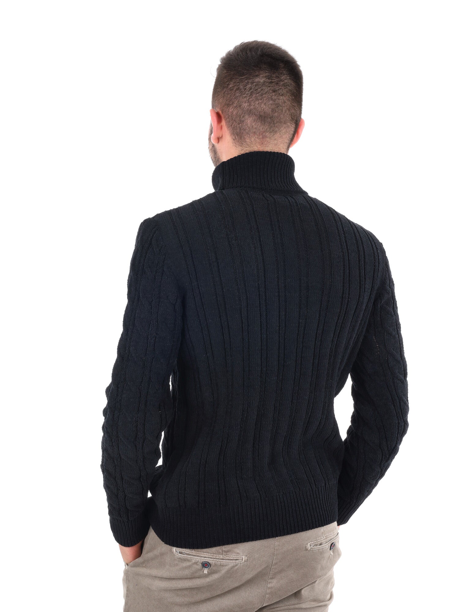 Il collo dolcevita e gli orli a costine aggiungono un tocco di eleganza funzionale, offrendo una calzata aderente che protegge dal freddo senza rinunciare allo stile. La trama a trecce dona carattere e profondità al capo, rendendolo perfetto per chi desidera distinguersi con un look sofisticato ma al tempo stesso pratico.