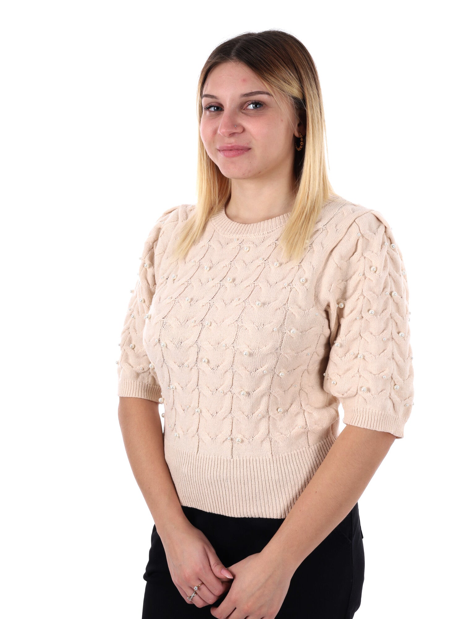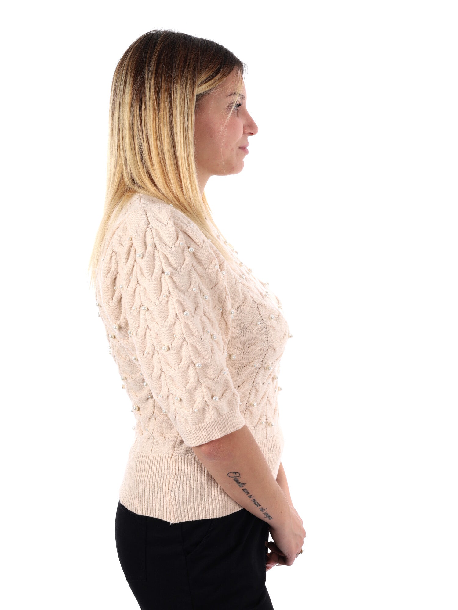 MAGLIA A MANICHE CORTE CON PERLE MISS LOVE DA DONNA CREMA