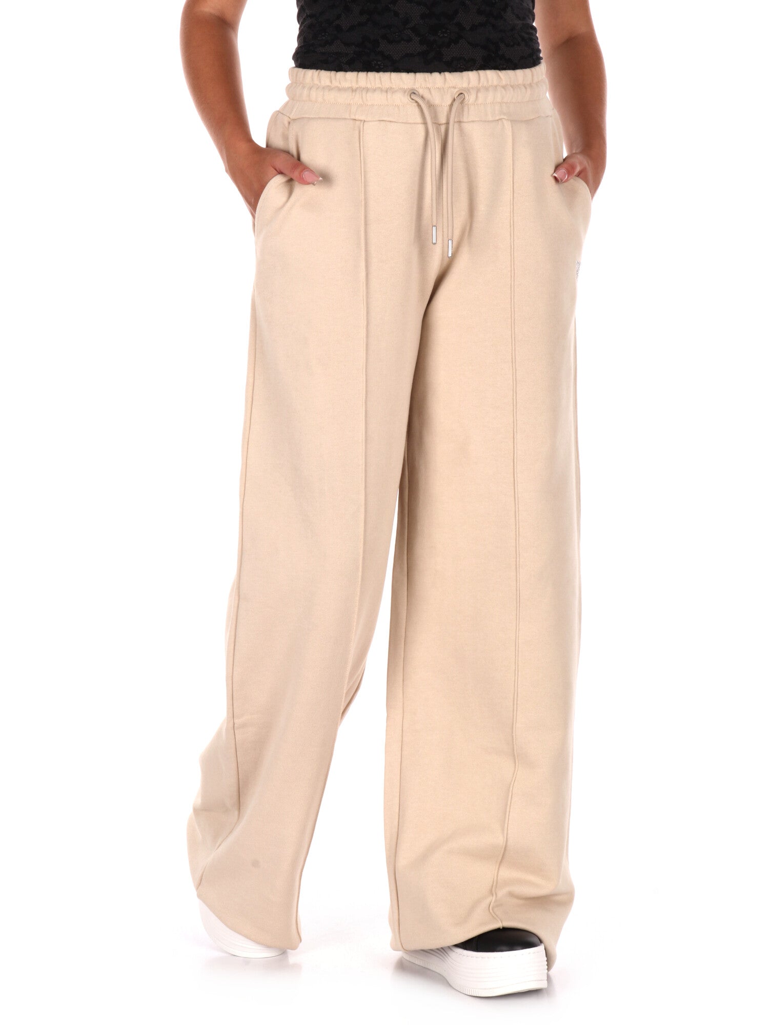 La vita alta è valorizzata da una fascia elastica con coulisse regolabile, mentre le due tasche laterali a taglio aggiungono praticità al design. La gamba larga dona un tocco moderno e rilassato. Le cuciture a vista e l’applicazione decorativa completano il look con dettagli distintivi.