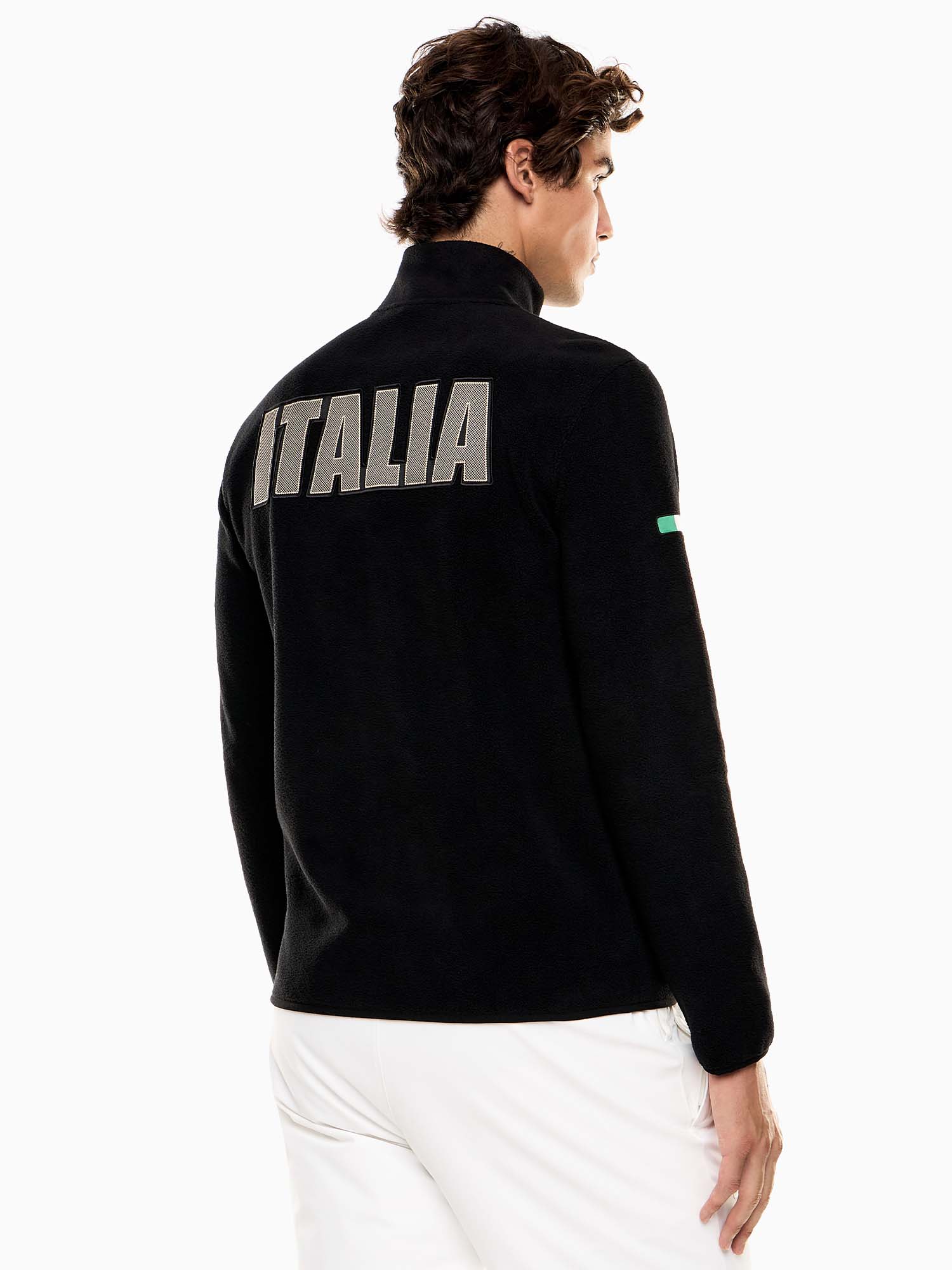 Sulla manica destra spicca il dettaglio tricolore stampato a contrasto, mentre sul petto i loghi istituzionali CONI e EA7 completano il design. La schiena è caratterizzata da una maxi patch “ITALIA” che rende il capo distintivo e patriottico. Perfetto per sostenere la squadra azzurra o per aggiungere un tocco sportivo e tecnico ai tuoi outfit.