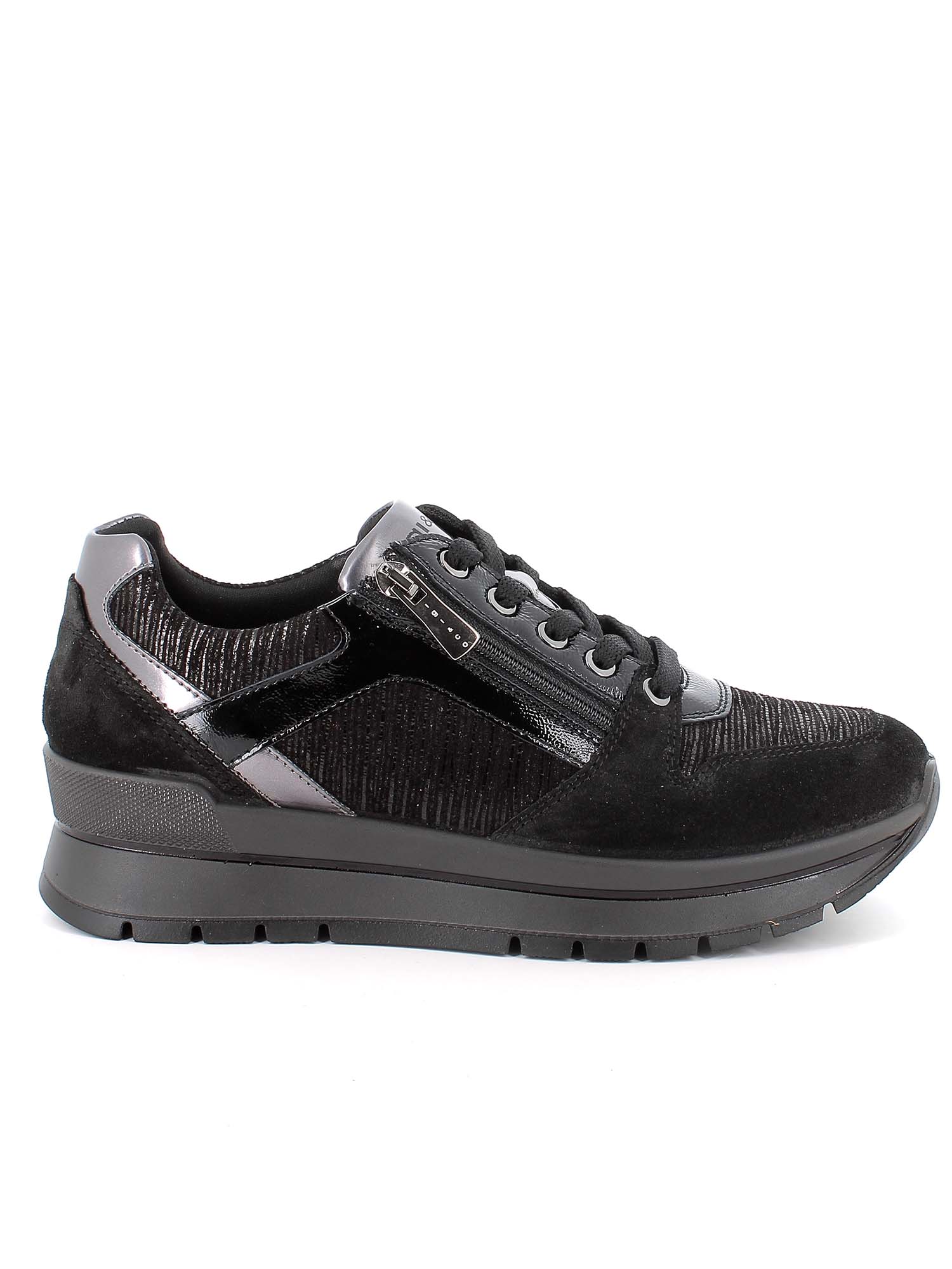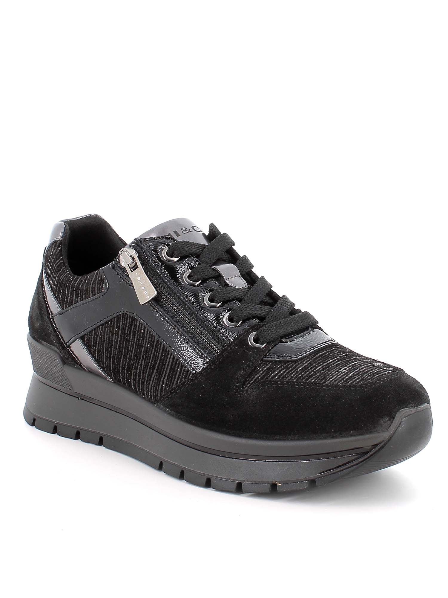 Perfette per affrontare la stagione con stile e dinamismo, le sneakers Anika di IGI&CO da donna si distinguono per il loro design moderno e sofisticato. Proposte in un'elegante tonalità nera, uniscono pelle liscia e inserti in camoscio per un effetto materico raffinato, esaltato da delicati dettagli laminati che aggiungono un tocco di luce e femminilità al look urbano.