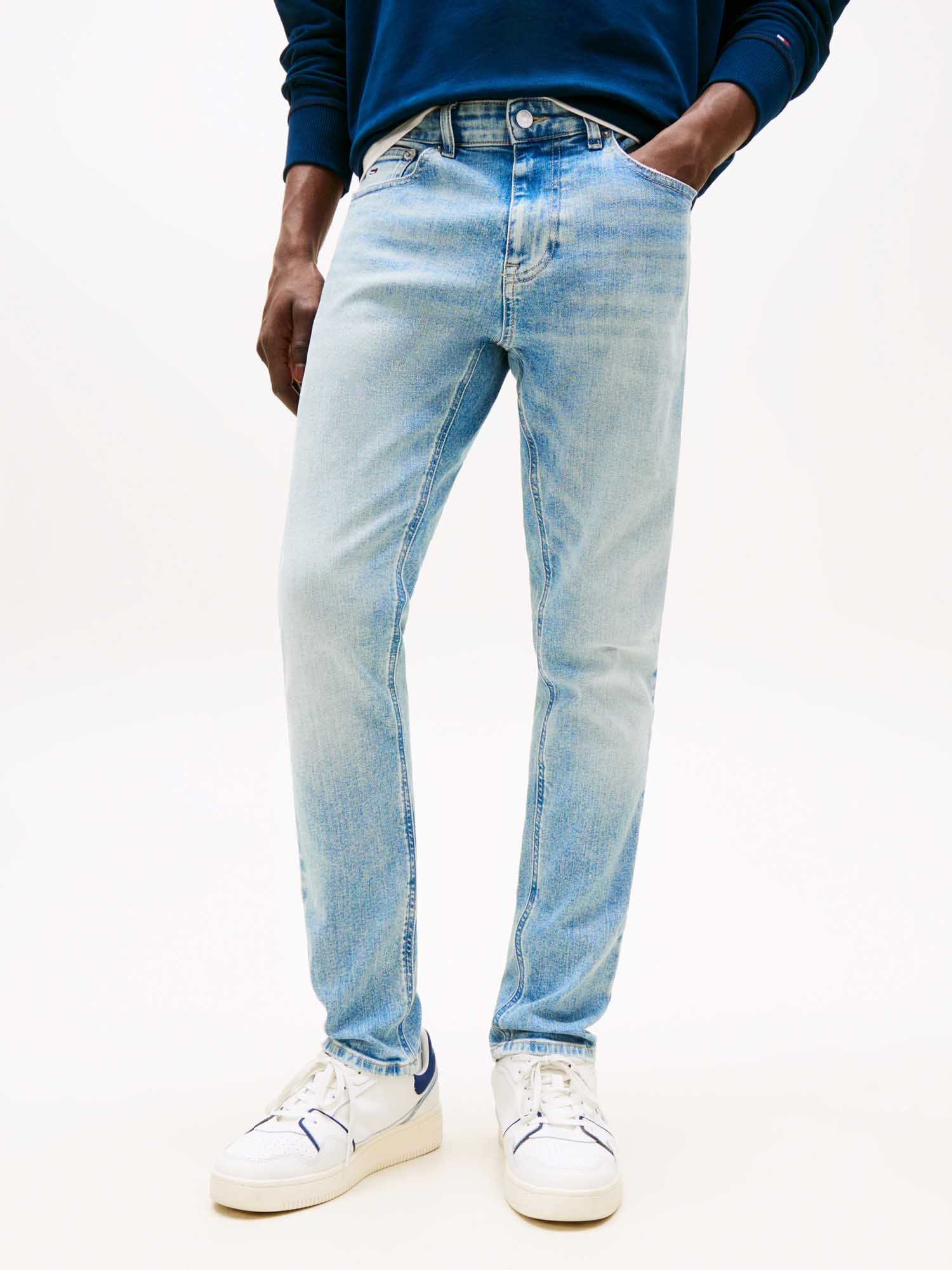 Denim da uomo cinque tasche della collezione Autunno/Inverno Tommy Jeans, realizzati in morbido cotone per unire comfort, libertà di movimento e resistenza. Gli iconici jeans Austin presentano un taglio slim che valorizza la silhouette senza rinunciare alla comodità. Il lavaggio chiaro dona al capo un look moderno e disinvolto, perfetto per ogni occasione casual. Dettagli distintivi come il logo iconico sulla tasca portamonete, la bandierina Tommy ricamata sul retro e la chiusura con zip e bottone completano il design. Un must-have contemporaneo e versatile per ogni guardaroba maschile.
